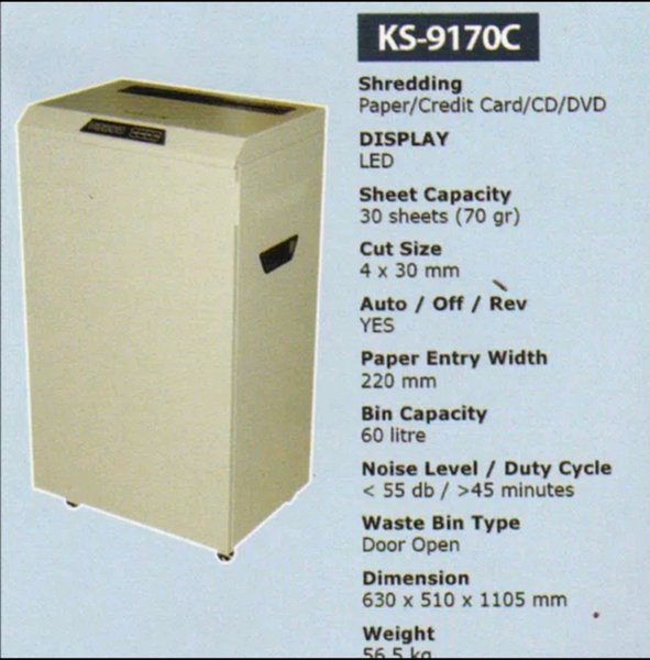Mesin Penghancur Kertas Kozure KS-9600 C Merek : Kozure Tipe : KS-9600 C Spesifikasi Shredding : Paper/Staples/cradit card/ CD Display: LCD Touch Screen Sheet Capacity : 20 Sheets (A4)/13 Sheets (A3) Cut Size : 4×40 mm Auto/Off/Rev: YES Paper Entry Widht : 320 mm Power Consumption: 400 watt Bin Capacity : 36 litre Dimension :… selengkapnya